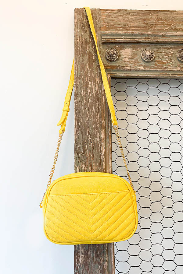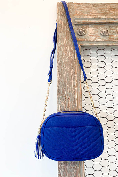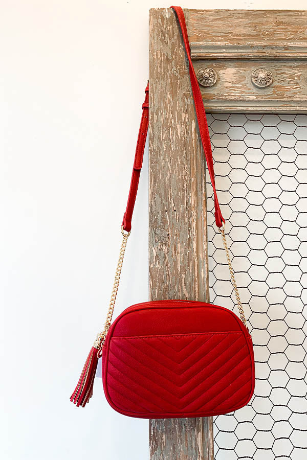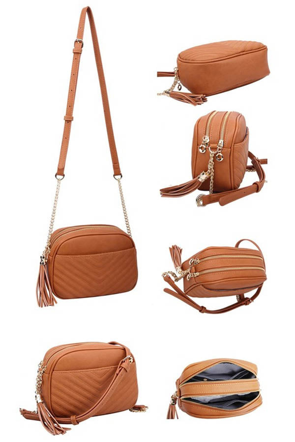 A vegan leather crossbody inspired by Saint Laurent goes for maximum impact with matelassé V-chevrons, gold hardware, dual zip compartments and a bold tassel at one side.