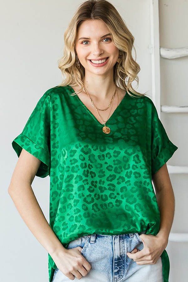 The sumptuous silky feel takes a relaxed stance in this short-sleeve leopard print top with simple styling that makes it a versatile addition to your closet.