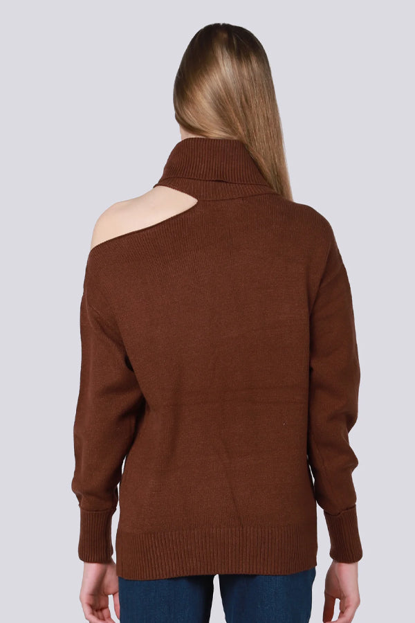 his sweater is designed to be both modern and classic. With its one cut-out shoulder and red-brown hue, this sweater will instantly become your go-to for weekends.