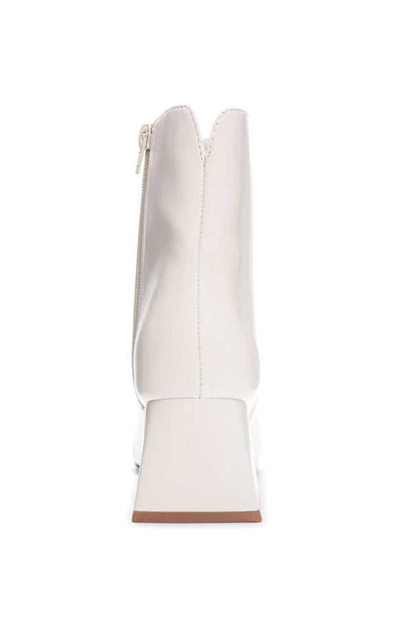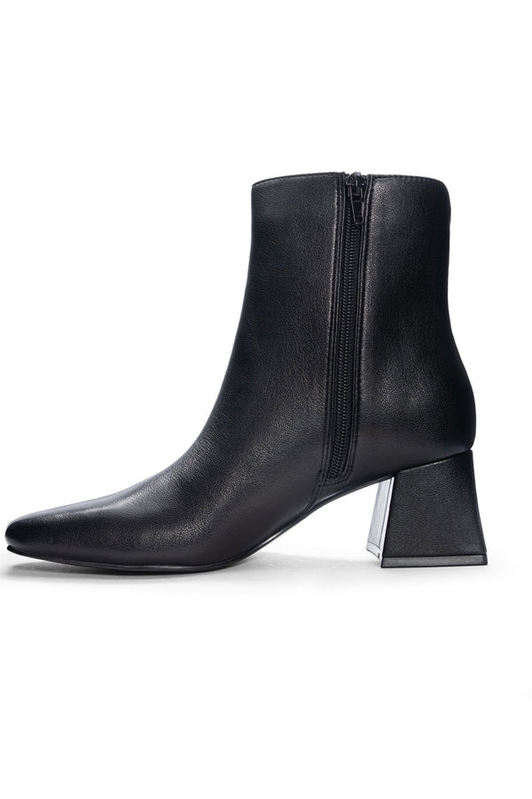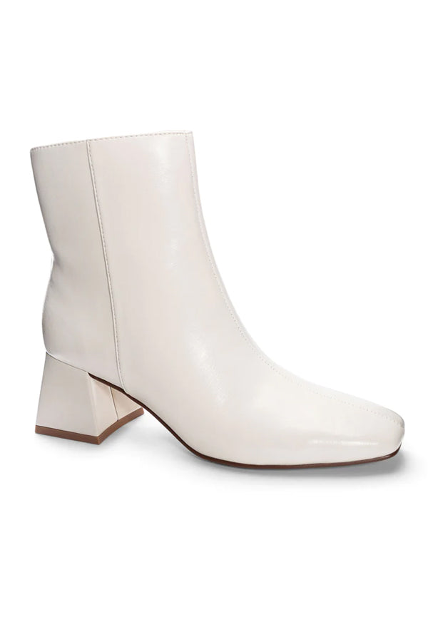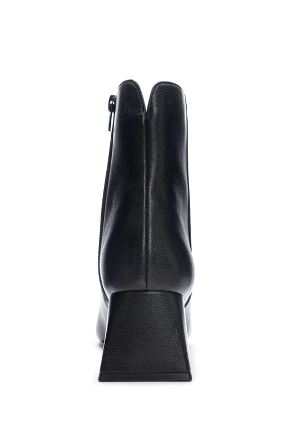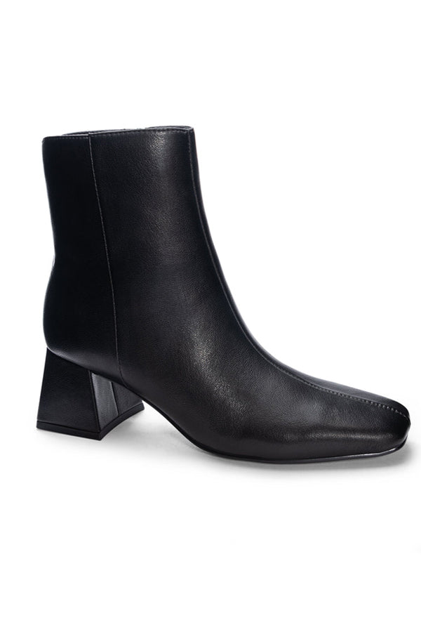 A square toe and flared block heel frame a mesmerizing bootie styled with a metallic upper for trendsetting appeal.