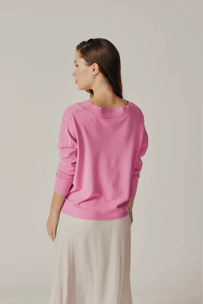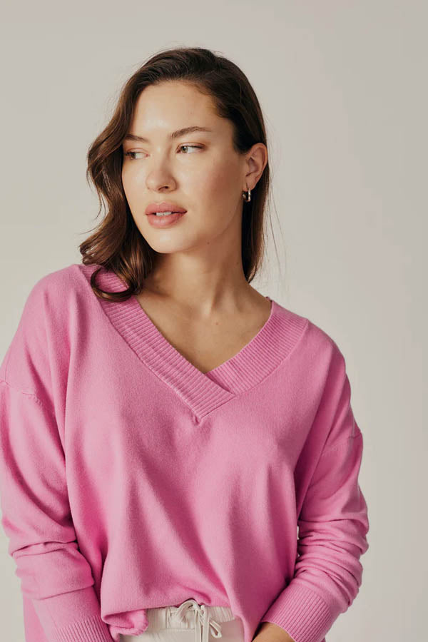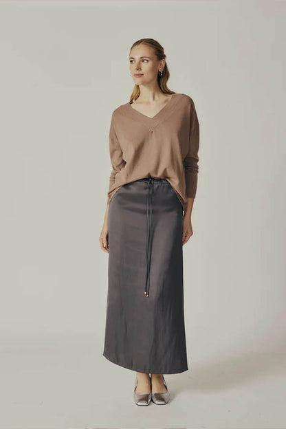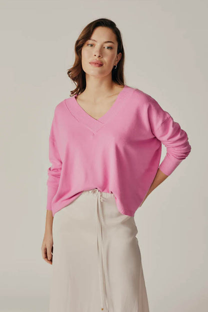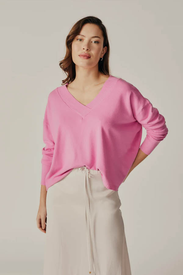 Viscose blend sweater with V neckline and long sleeves. Curved hem on the front and longer at the back