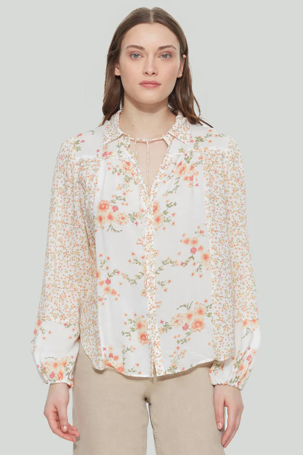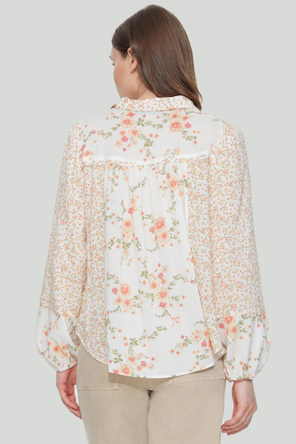 Lightweight and semi-sheer fabric, with a contrasting floral print, shapes this darling top that has a tie-collared neckline with a raw edge back detail at the yoke and long balloon-like sleeves with elastic ruffle cuffs. The flowy bodice is accented with matching buttons and finished with rounded hem.
