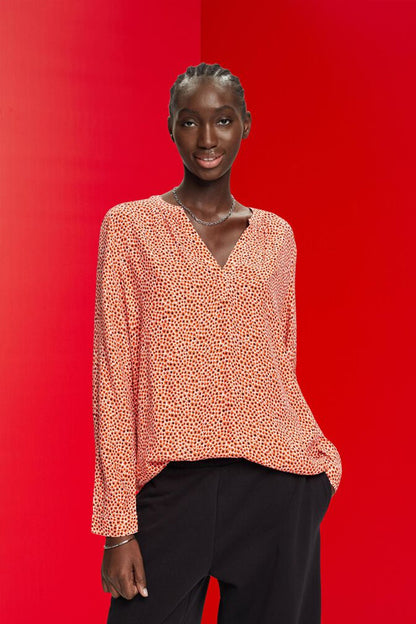 Add a spring-like flair to your wardrobe with this floral blouse made from lightweight woven fabric.
