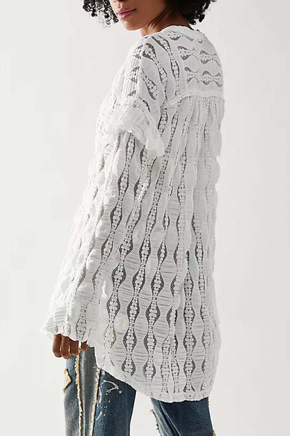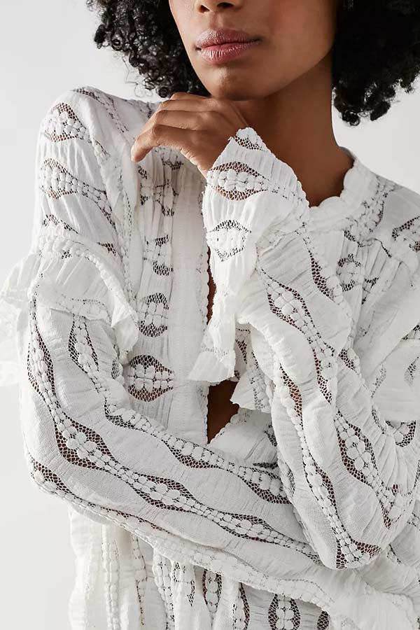 Just as versatile as it is vintage-inspired, this timeless tunic is featured in a textured, lace-adorned fabrication with V-neckline and ruffle detailing at shoulders for added dimension.