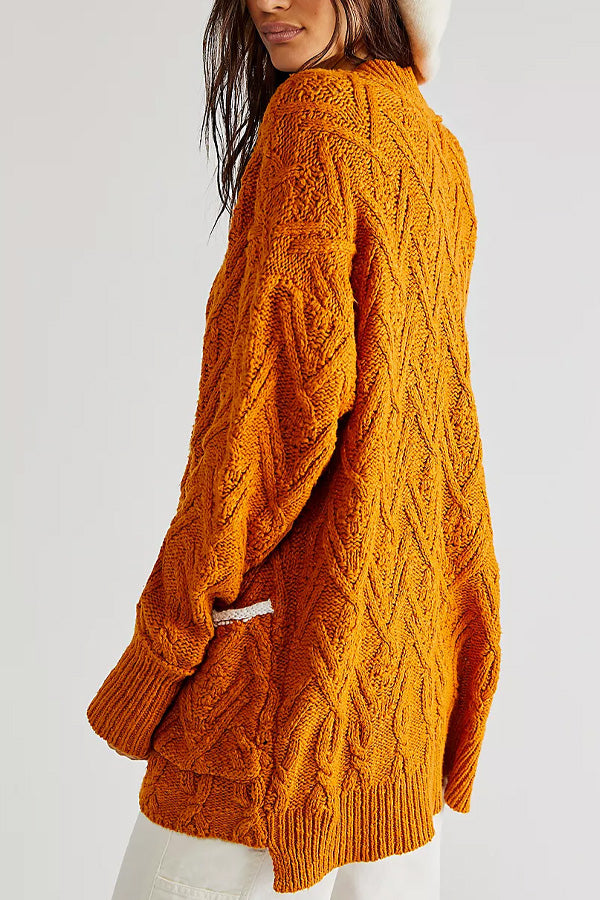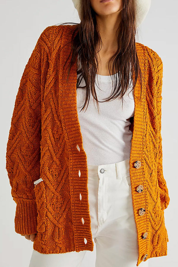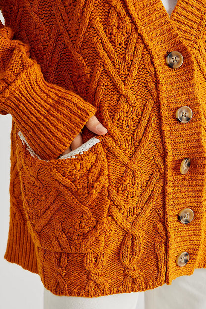 The perfect cardigan featured in a classic cable knit design with button-front closure and contrast top hem on pockets for added dimension.