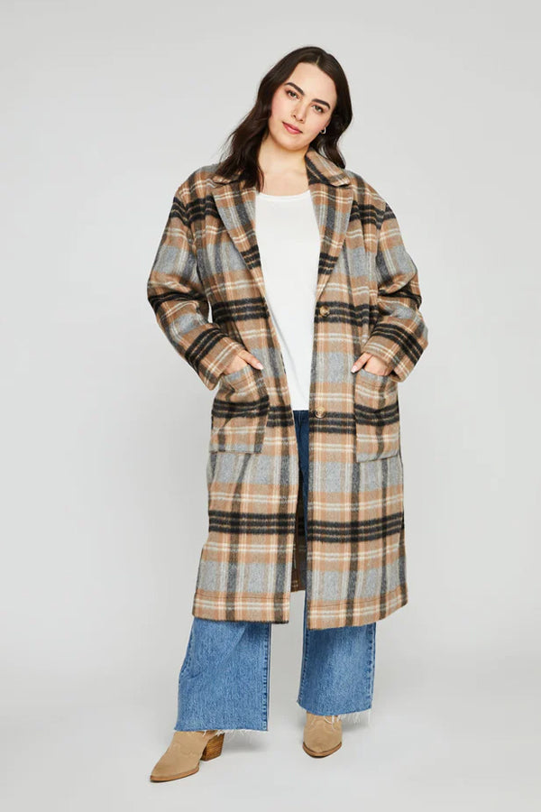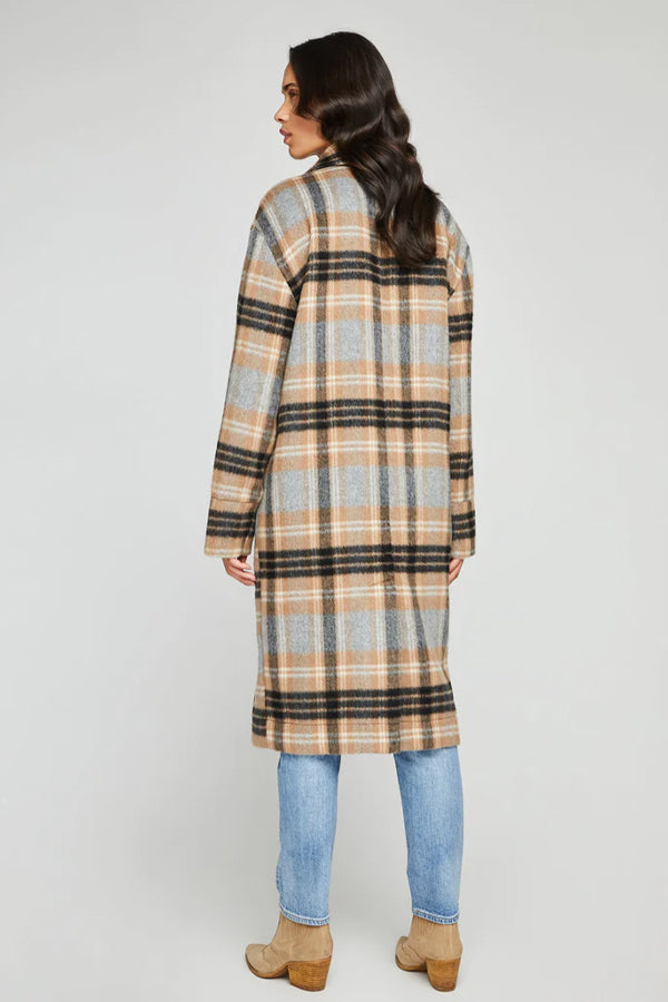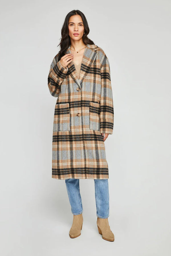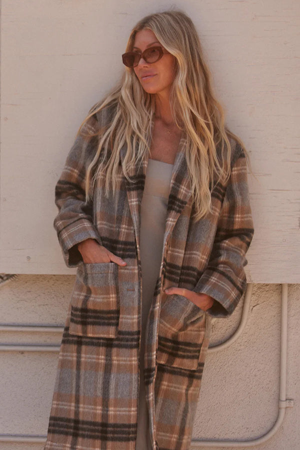 The Ezra coat is made of a soft, brushed plaid fabric. The relaxed silhouette features a collar and lapel for an effortless and elevated look.
