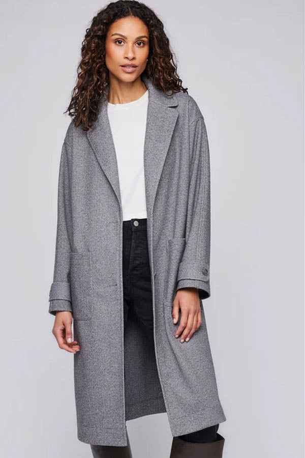 The Jude coat is made of a soft, brushed herringbone fabric. Features include a sleeve cuff detail, patch pockets, and lined sleeves for ease of wear.