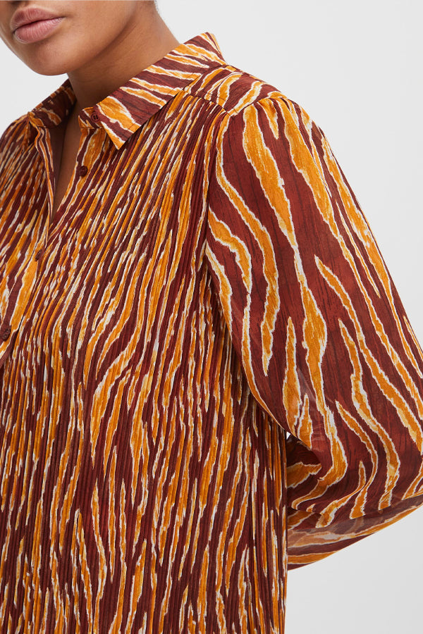 The dress has a shirt collar and closes with buttons at the front. It has long sleeves with elasticated cuffs. The pleats allow the dress to fall and float.