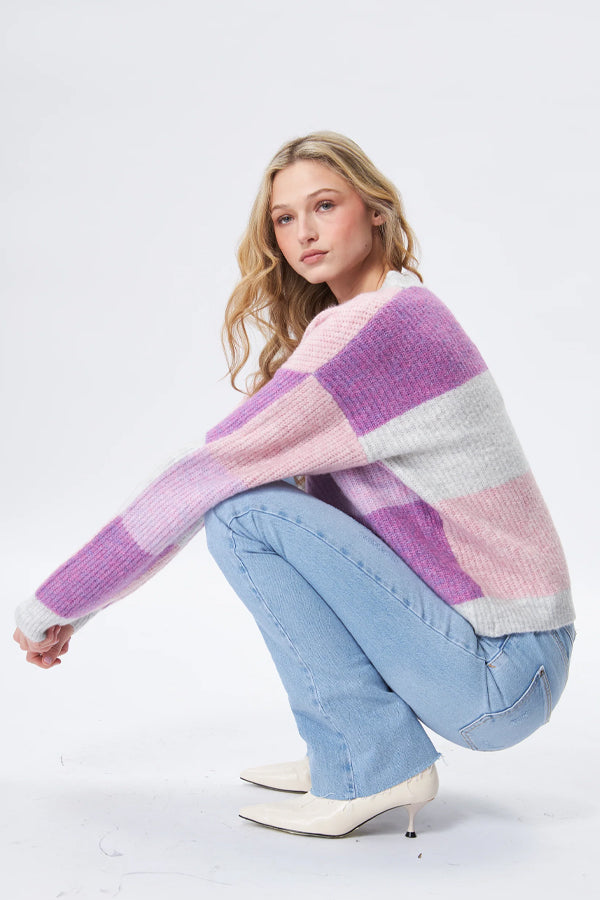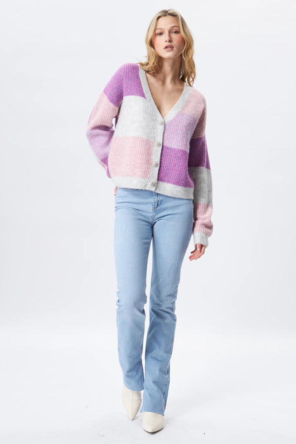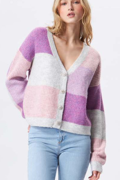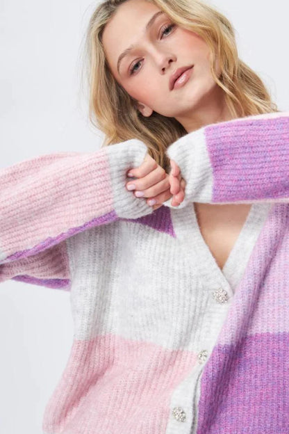 This candy-hued striped cardigan is the epitome of refined elegance, designed with a relaxed fit and crystal button detailing for an extra touch of luxury. Perfect for dressing up a casual ensemble with sophisticated flair.