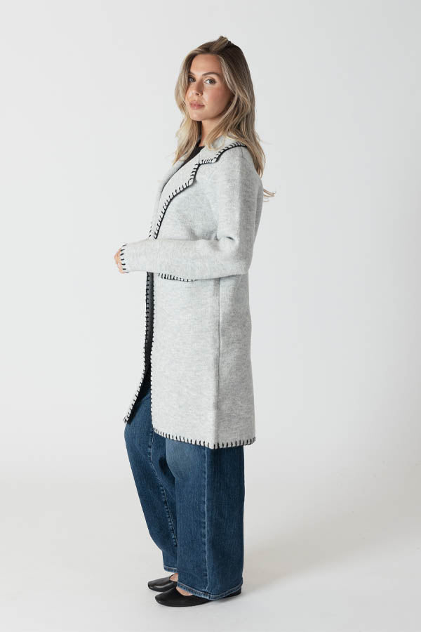 This fitted knit coat is a sophisticated blend of comfort and style. Make a statement with the Fiona Stitch coat, featuring a notch collar, pocket flaps, and contrasting whip stitched detailing. This coat hugs your silhouette in all the right places, offering both warmth and elegance.