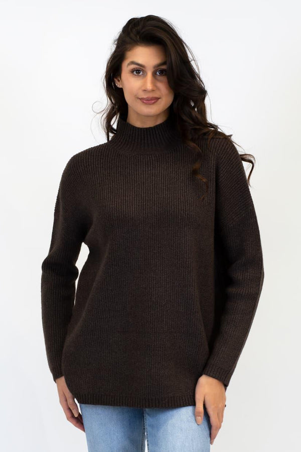 The Braeden is an oversized sweater that features a mock neck and is available in chocolate marl. All we can say is, we are obsessed!