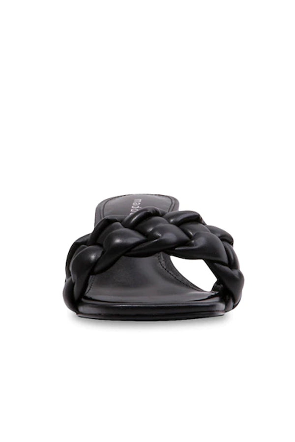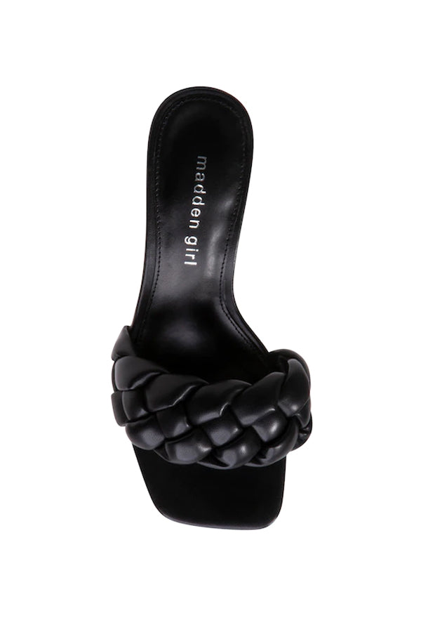 Designed exclusively to elevate your fashion, these women's Madden Girl black dress sandals are versatile enough for multiple occasions. Showcasing an attractive braided single-band faux leather upper, these sandals have an open square toe front, effortless slip-on entry style, comfortable faux leather footbed with signature lettering print and a grip offering rubber outsole along with a stylish kitten heel.