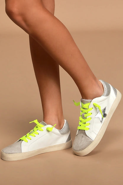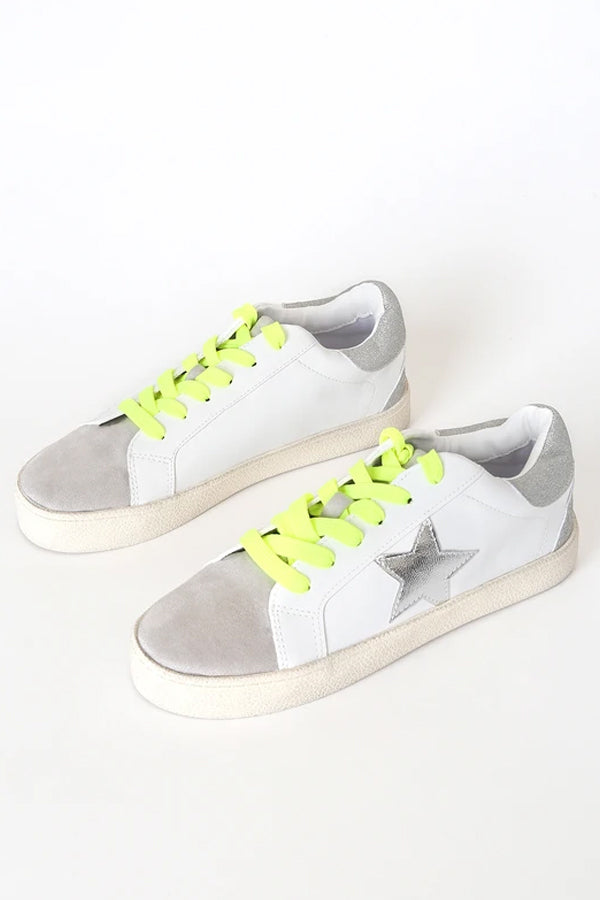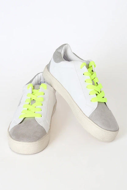 Put some pep in your step with the Madden Girl Linlee White Multi Sneakers! Sleek faux leather shapes these low-top sneakers with a soft faux suede upper and a rounded toe, neon green lace-up vamp, and a contrasting shiny silver star at the out-step. A fun silver glitter accent at back completes the look. 1" textured rubber bumper sole. White laces included.