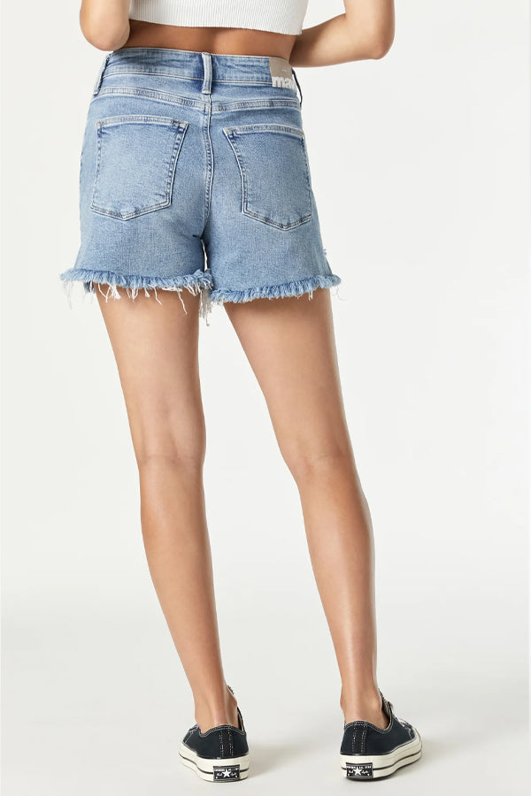 The relaxed Heidi short has edgy rips and a fringe hem that gives them the look of a well-loved favorite. This is a midweight denim with a small amount of stretch. Composed of partially recycled cotton, this fabric has a rigid look and feel straight from the 90's.