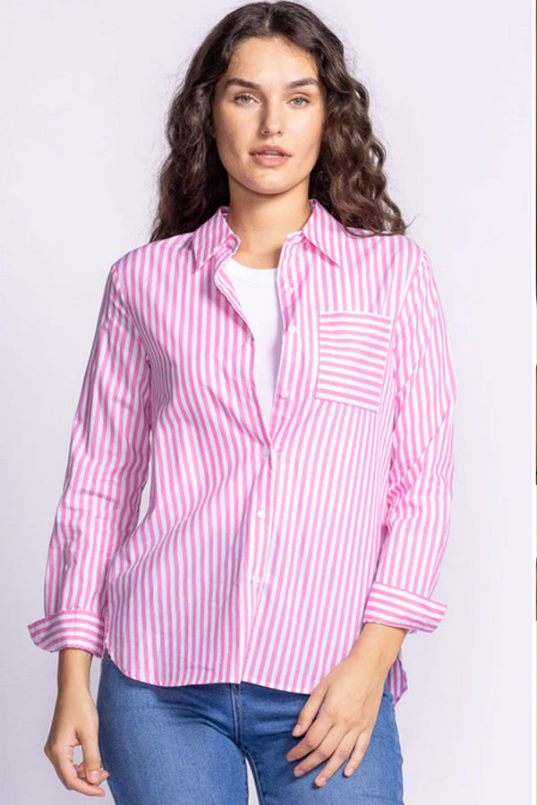 The Dorit Top is a striped button-down shirt featuring a classic collar, cuffs, and a front pocket for a polished yet playful vibe. Super cute and versatile—style it tucked into jeans or layered over a tank for an effortlessly chic look!