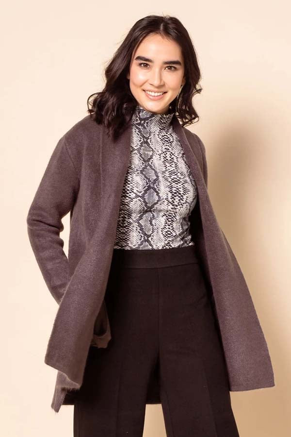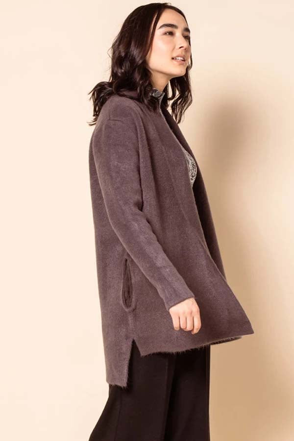 The Stockholm jacket is a soft and fuzzy cardigan-like jacket, with an open front and a fold over collar. Slightly longer in the back than in the front and deep inseam pockets! A perfect longer layering piece.
