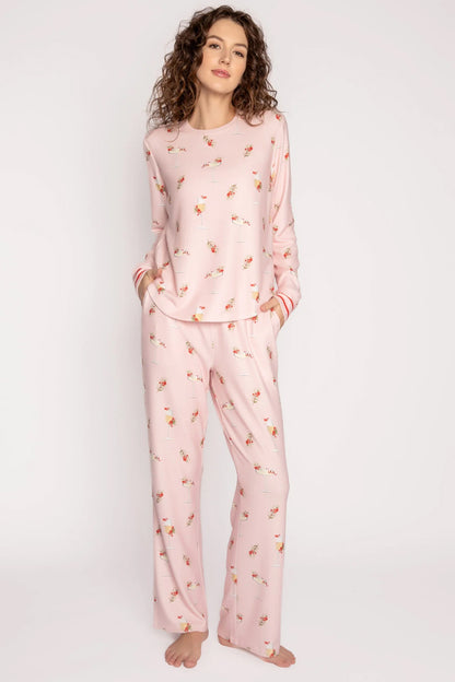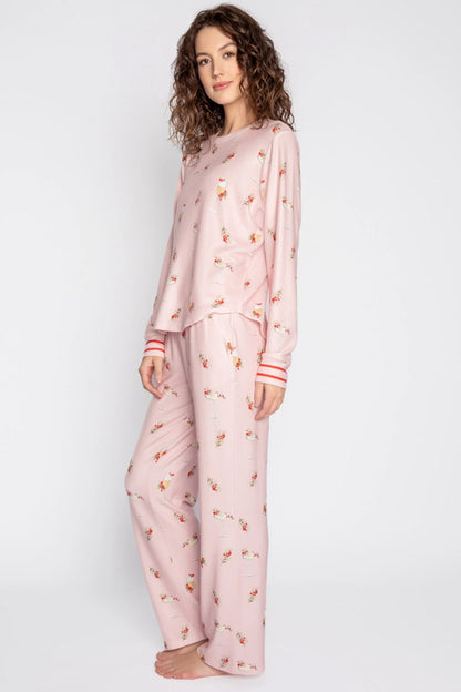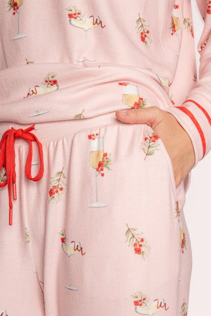 The perfect lounge set to sit back, relax & enjoy winter. Lounge top & relaxed pj pant in a festive print of winter cheer, mistletoe & cocktails.
