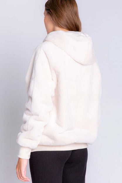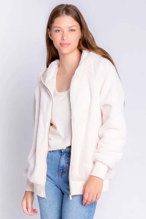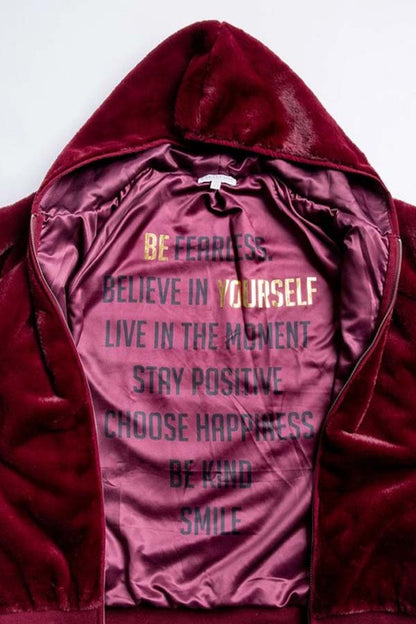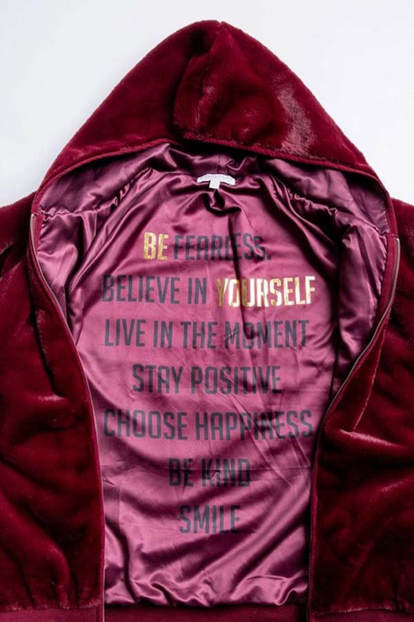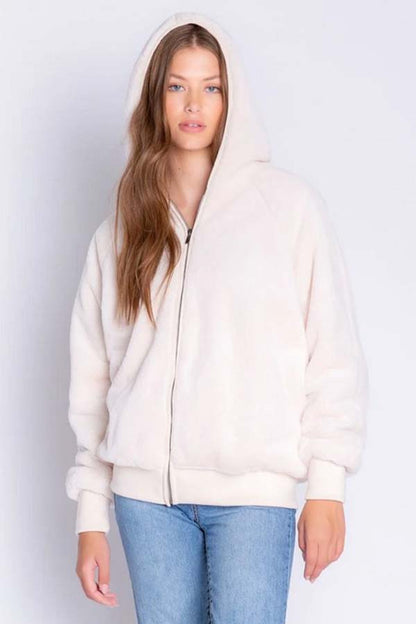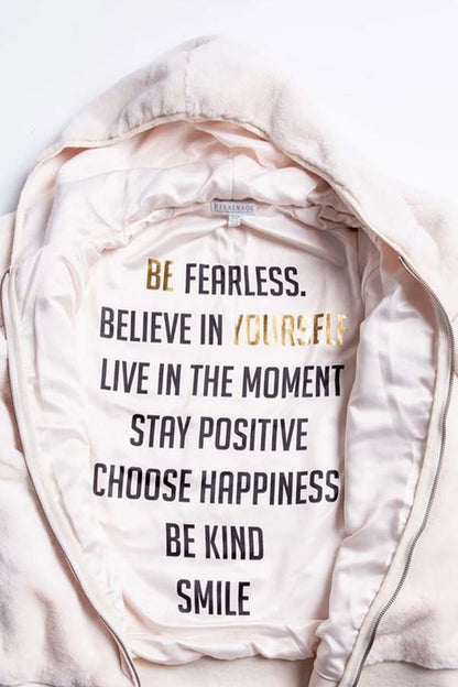 A cozy zip-front faux fur hoodie with side pockets. Printed satin lining printed with metallic inspirational messages. Your favourite new layer this winter!