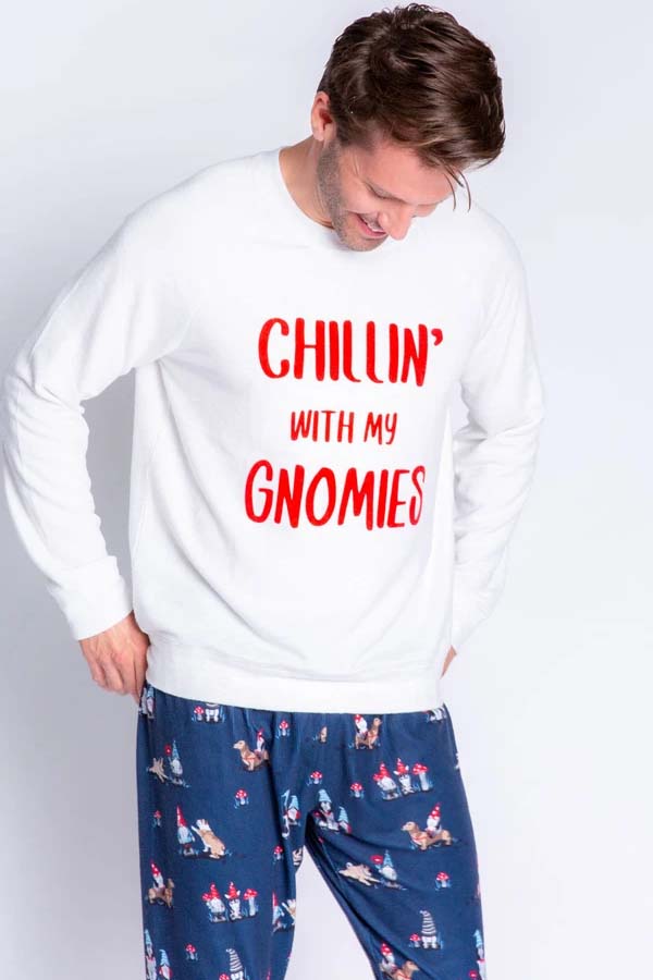 Welcome PJ Salvage For MEN! This Men’s Festive top features a bold graphic gnomies print on soft peachy fabric for cozy winter nights! Perfect for holiday photos and moments.