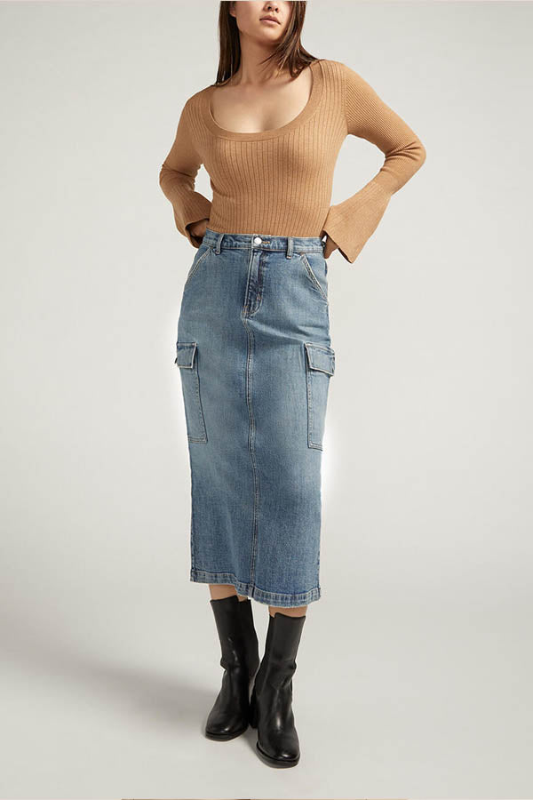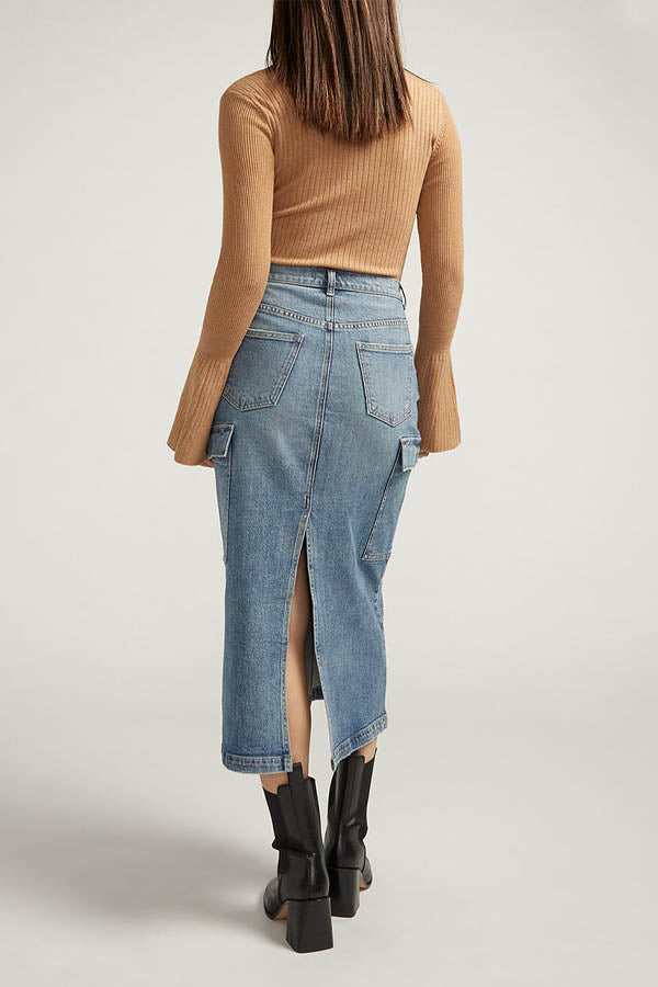 Meet your staple denim skirt for spring and beyond. Our medium wash midi cargo skirt is the perfect statement piece, dressed up or down. With side cargo pockets and a back slit, this is a skirt you'll love wearing everywhere.