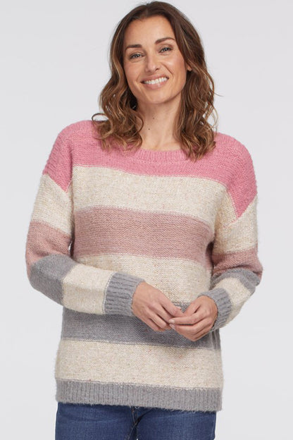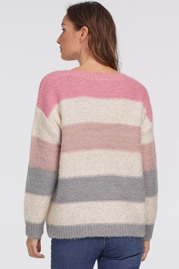 If we had to choose just one sweater this season, this one would be it! Horizontal stripes are always a classic, and fall wouldn’t be the same without soft sweaters that feel like a warm hug. Striped in mauvy pinks, rose, grey, and cream, and just the right amount of gold metallic strands this boat neck sweater is the ultimate piece to warm-up your wardrobe.