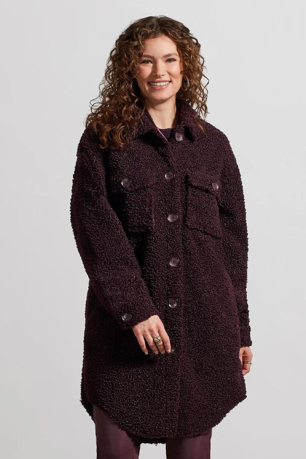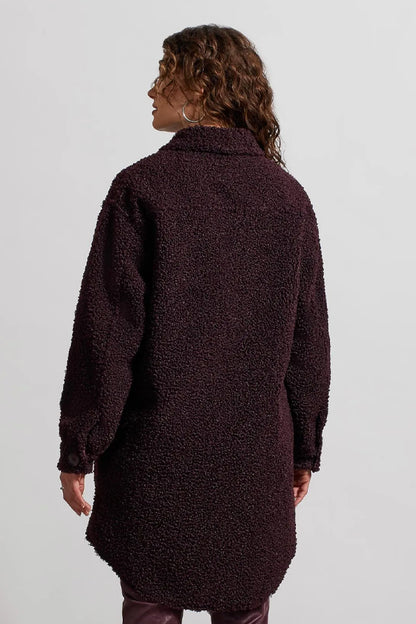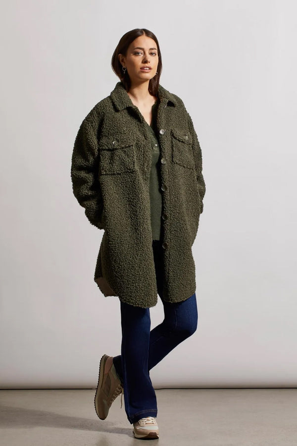 An oversize fit and drop shoulder seams bring easy-going elegance to this fashionably fuzzy jacket. We're obsessed with the fuzzy shearling fabric, long-sleeve design, 38" length that offers more coverage on brisk days, curved hem, patch pockets at the chest, and hidden side-seam pockets by the hips.