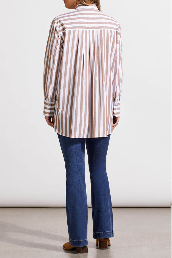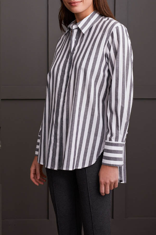 Experience timeless style with a bold twist in this button-up shirt, designed to withstand the test of time. Featuring eye-catching stripes, a crisp collared neckline, and long sleeves adorned with buttoned cuffs, it exudes sophistication. Back pleats ensure freedom of movement, while the curved shirttail hem adds a classic yet versatile finish, perfect for tucking in, wearing loose, or tying up.