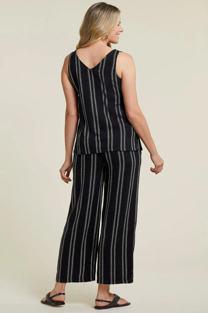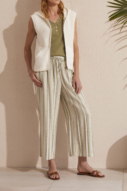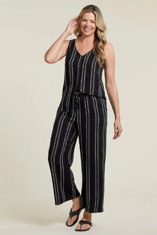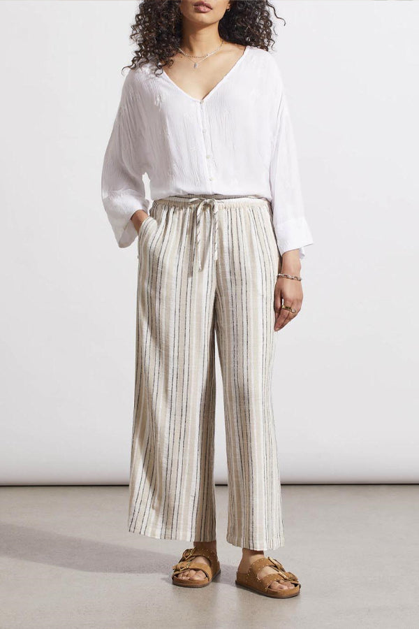Flowy, striped pattern in a casual, wide leg pant is perfect poolside or patio side. The 26" inseam gives a breezy look and shows off the ankles.The waist is fully elasticized and completed with a drawstring. The Crinkly fabric and side seam pockets pair perfectly with matching tank or with a basic tee!