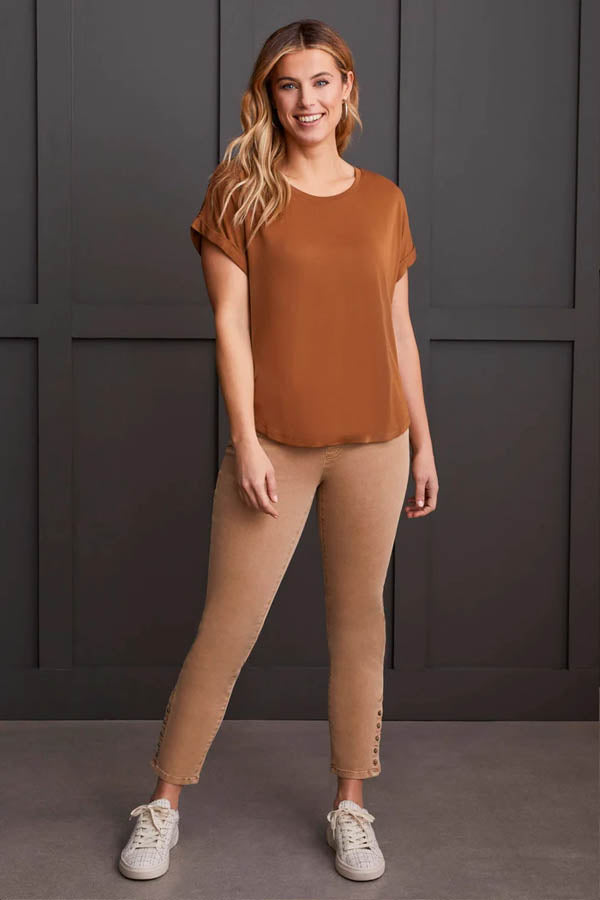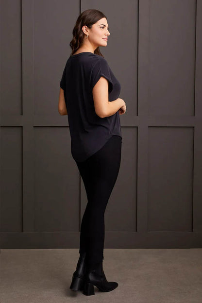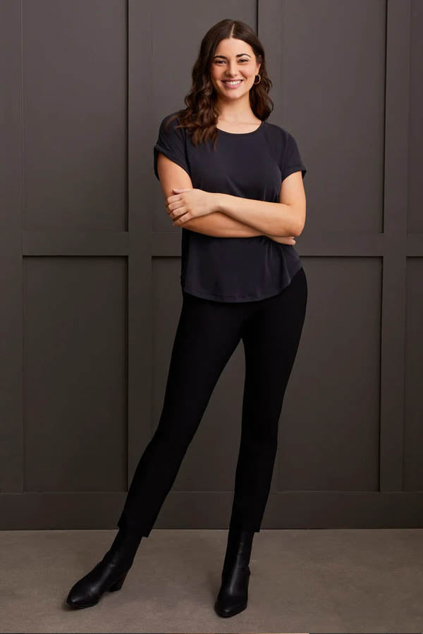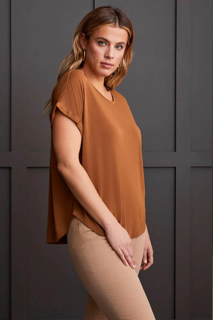 Indulge in the ultimate combination of luxurious comfort and effortless sophistication with this crew neck top. Meticulously crafted from sumptuous modal jersey fabric, it features a loose fit for an airy, lightweight feel. The short sleeves with a turned-up cuff add a hint of casual elegance. Completed with a flattering shirttail hem that beautifully enhances your silhouette.