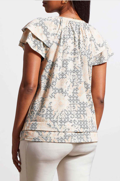 This Peasant Blouse with its double ruffle cap sleeve and tie neckline as a beautiful femine feel.