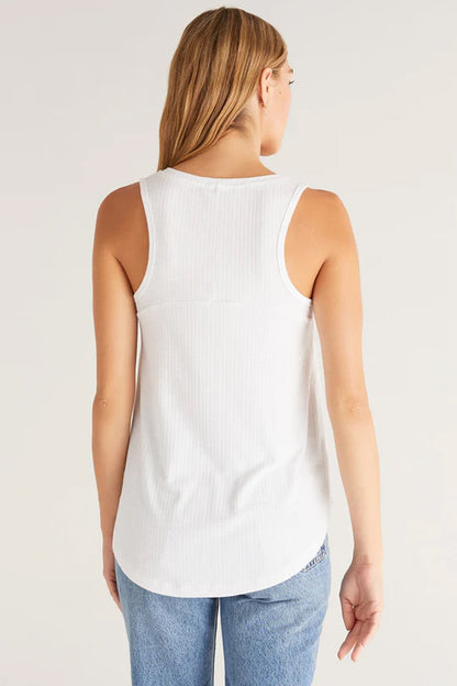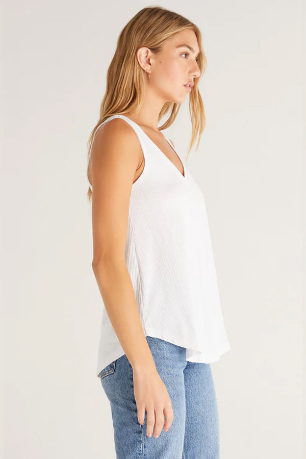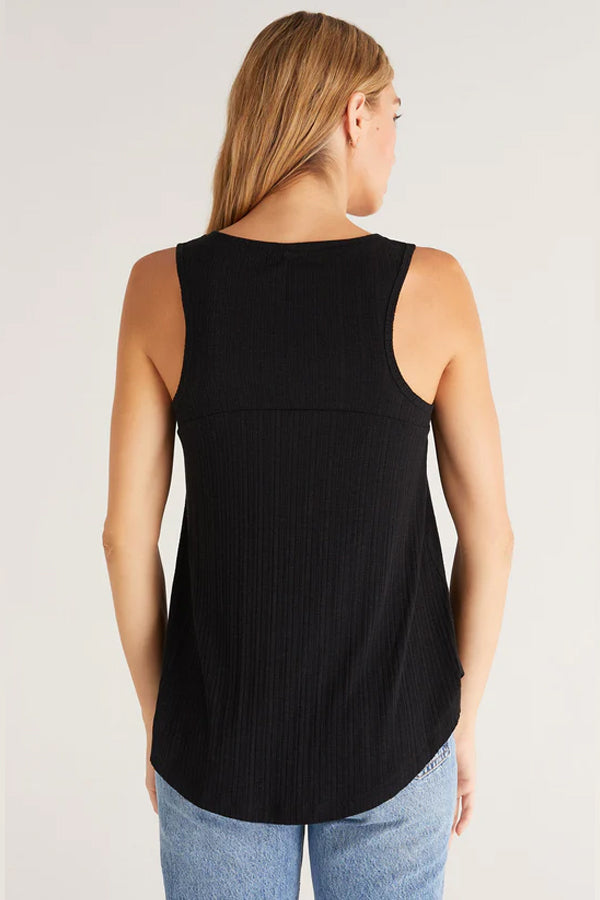 This tank features a v-neckline, yoke back, and relaxed fit for all day comfort. Made using soft Spandex Slub Rib fabric, it has a flattering curved hem and length that looks so good with your fave jeans.